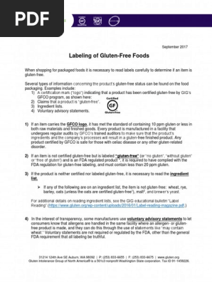 Gluten-Free Diet & Label Reading Guide - Celiac Disease Foundation Label Reading & the FDA. Gluten-Free Candy List. Gluten in Medicine, Vitamins & Supplements. FODMAPs and Celiac Disease. Gluten-Free. Meal Plans. Eat! Gluten-Free. Gluten-Free Recipes. Gluten Free Label Reading 101 - Jenny Irvine Gluten-free and label reading-are like "peas and carrots" they just go together. The word "gluten" is not a labeled ingredient on food labels so it requires a bit of consumer knowledge. It is "where" and "in what" listed ingredients gluten hides that a gluten-free consumer must educate themselves. Label reading truly becomes ... 4 Steps to Reading Labels on a Gluten-Free Diet - Spoonful Blog Step 1: Look for Certification Seals When shopping for gluten-free products, look for any of the 5 certification seals shown below. These seals guarantee that the product has been tested by a third party and that the level of gluten is less than 10 parts per million (ppm). This is even stricter than the FDA requirement of 20 ppm. PDF Step-by-Step Guide to Reading Gluten-Free Labels 1 2 3 - Beyond Celiac manufacturers may use the term "gluten-free" if the product contains less than 20 ppm gluten. Third-part y certification can help provide reassurance. (Making a gluten-free claim is voluntary, foods not labeled gluten-free do not necessarily contain gluten.) 3 Read ingredients statements. Look for wheat, rye, barley, oats and